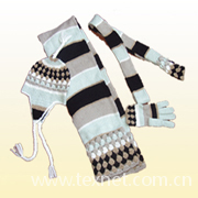 围巾30%羊毛70%晴纶无线提花、手套10%锦纶20%兔毛70%羊毛针织布裁剪后再缝制。